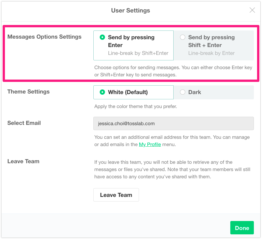 - On [Messages Options Settings], check [Send by pressing Enter] or [Send by pressing Shift + Enter].