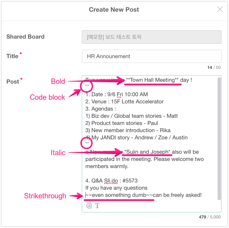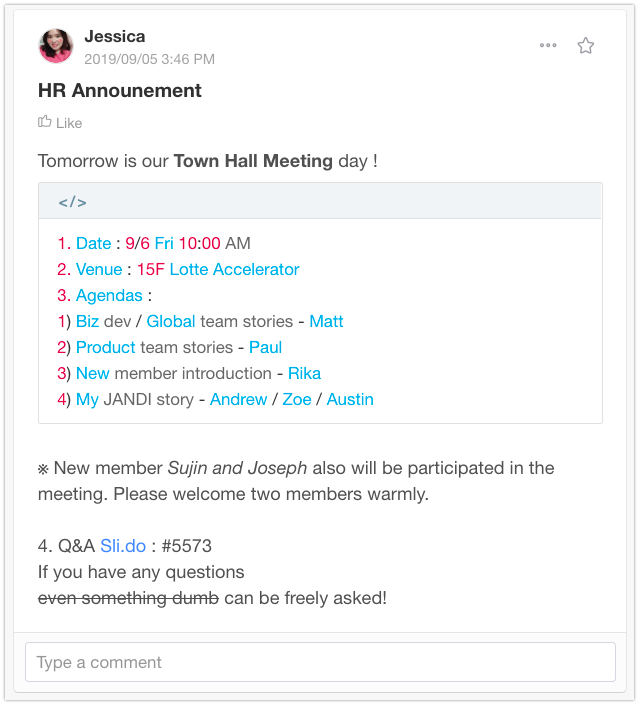 Hello! This is Jessica from the CX team. Did you know that there are ways to add effects to JANDI messages? Although they aren’t as fancy as text input programs, JANDI texts have 6 available effects to enhance the readability of messages. Let me show you some examples and how to use them.