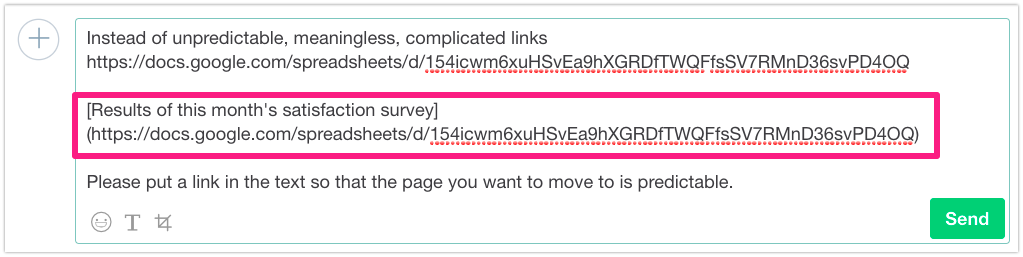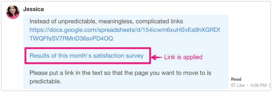 It is often used to connect complex and long links to messages, as shown in the example below. Since the linked messages can be searched, later on, it would be easier to find records using keywords like ‘Service Experience Survey’ for example, right?