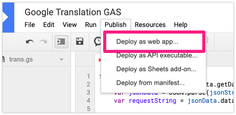 Click ‘Publish‘ menu – Deploy as a web app – After setting the access scope, click the ‘Deploy‘ button – Review the Authorization and log in your Google account – When the ‘Unverified app’ screen is displayed, go to ‘Advanced‘ – Click ‘Google Translate GAS (Unsafe)’ – Click the ‘Allow‘ button