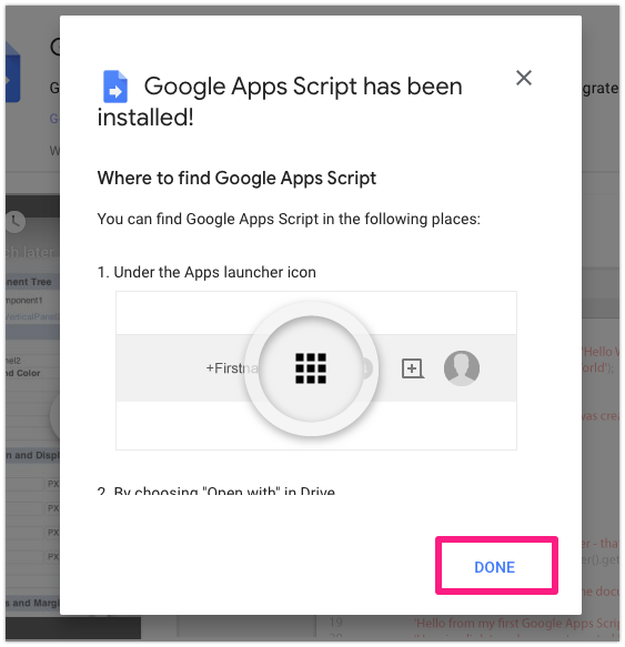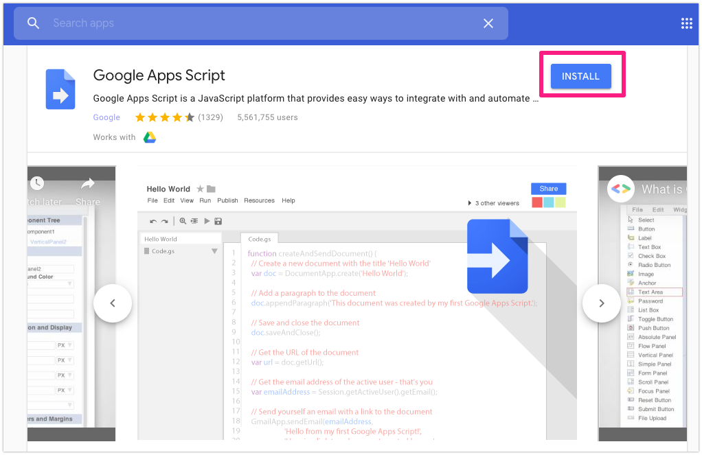 2-2) Search and installGoogle Apps Script. Please click the buttons following the images below.
