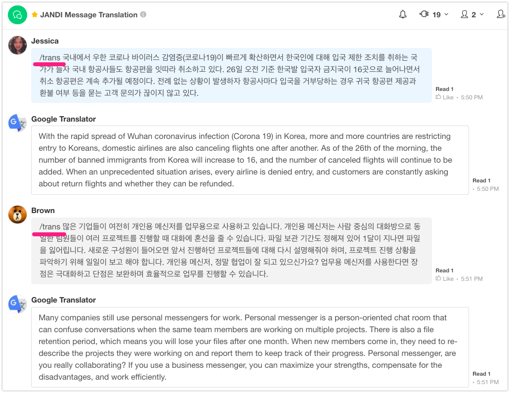 Now let’s translate JANDI messages. The original source text language is set to Korean. And the translated messages will be written in English. Trigger the message translation as in the example below. I set the trigger keyword to ‘/trans’.