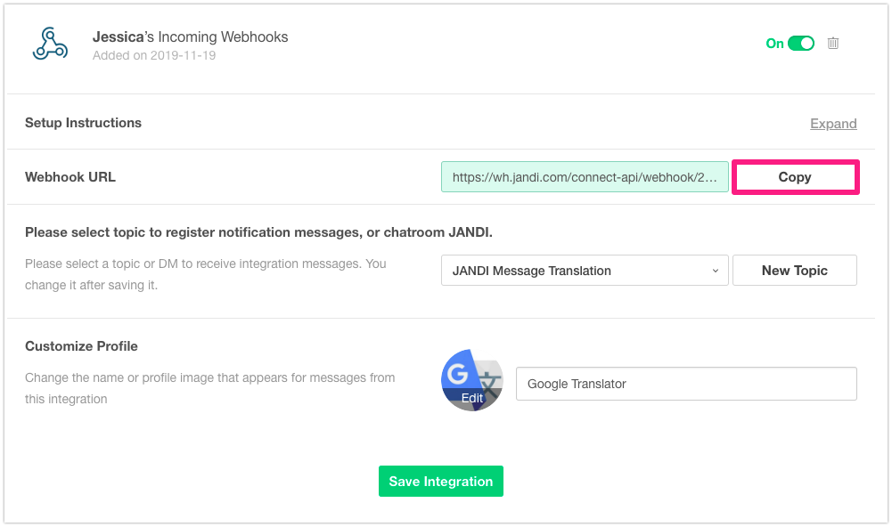 3-2) Click the [Save Integration] button to complete the JANDI Connect Outgoing Webhook making.