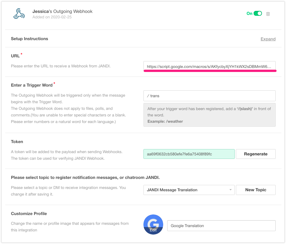 ‘JANDI Message Translation’ is the topic I connected Incoming Webhook and Outgoing Webhook.