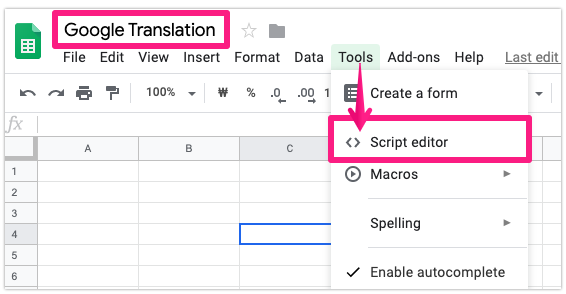 Change the sheet title to Google Translation– click ‘Script editor’ on the ‘Tools’ menu.