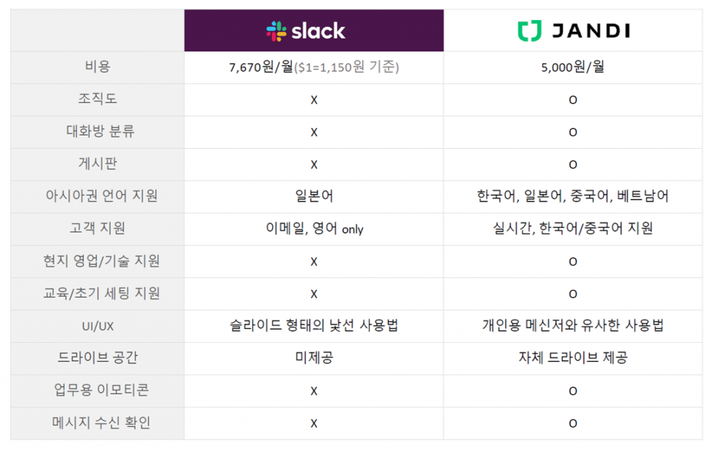 반면 슬랙은 국내 및 아시아권 유저에게는 언어뿐 아니라 UI까지도 어렵고 낯설게 느껴질 수 있습니다. 실제 국내 기업 중에는 슬랙의 많은 기능들을 뒤로 한 채 단순 메신저로만 사용하는 경우도 있다고 하는데요, 아무리 많은 기능이 있어도 당장 유저가 사용하기 어렵다면 제대로 된 협업을 기대하기 어렵겠죠?