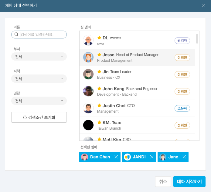 멤버 이름, 부서, 직책, 권한을 검색해 그룹채팅방에 초대할 멤버를 선택할 수 있습니다.