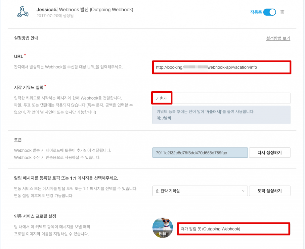 - URL은 잔디에서 발송되는 메시지 형태의 웹훅을 수신할 서버를 말합니다.