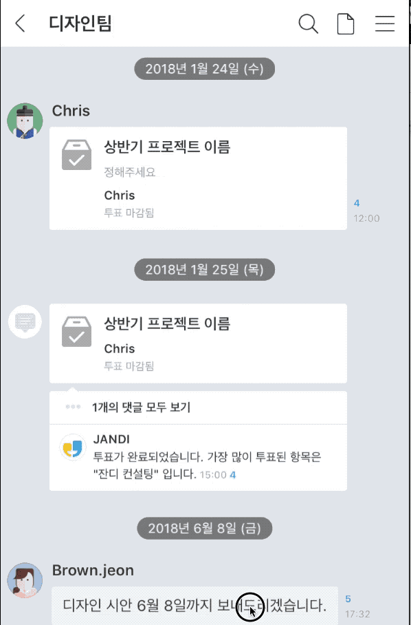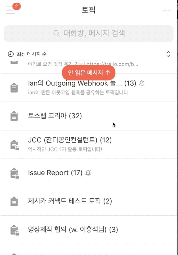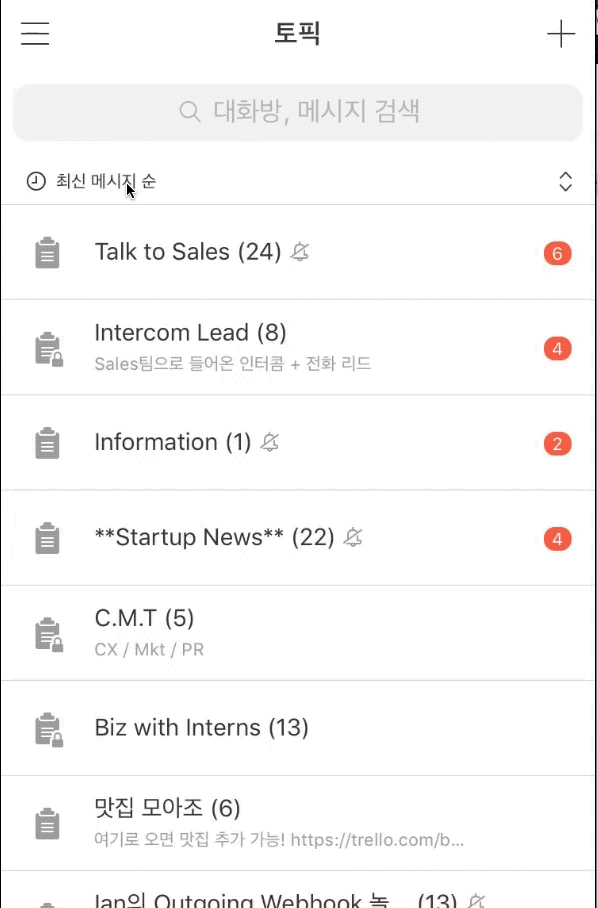 - 토픽 정렬을 ‘기본 정렬 순’ → ‘최신 메시지 순’으로 변경하면, 새로운 메시지가 있는 토픽부터 상단에 노출되어 구분이 쉬워집니다.