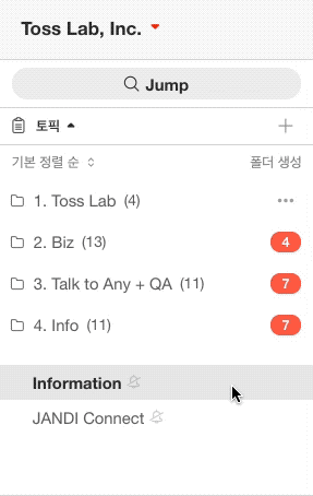 - 파일을 폴더별로 정리하듯이 잔디에서는 토픽을 폴더별로 정리 가능합니다. 단, 폴더 구성은 개인에게만 적용되어 다른 구성원에게 영향을 미치지 않습니다.
