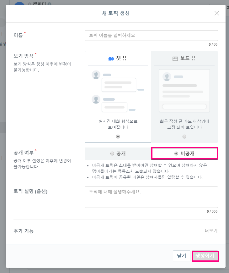 *토픽의 공개와 비공개 설정은 토픽 생성 이후에는 변경이 불가능하니 신중하게 선택해야 합니다.