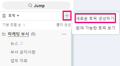 토픽이란, 주제별 대화방을 말합니다. (예시: 부서 공지사항, 업무 자료방, 일정 공유 등)