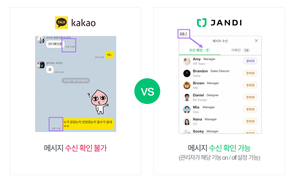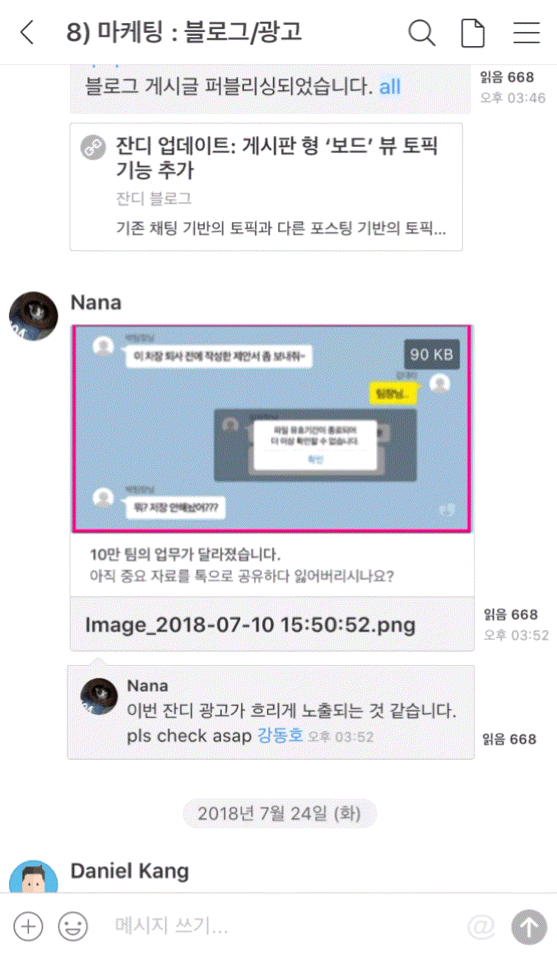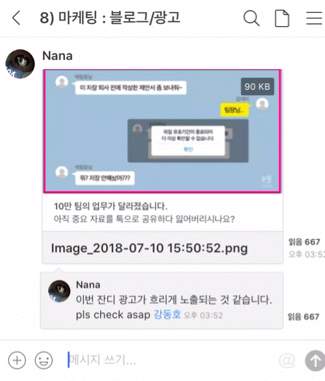 카카오톡은 개인용 메신저이기 때문에 퇴근 후, 주말에 업무 내용을 공유하면 멤버들에게 알림이 갈 수 밖에 없습니다. 심지어 병가나 휴가를 낸 멤버에게까지 말입니다.