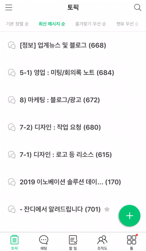 - 주제별, 프로젝트별 대화방(토픽) 생성