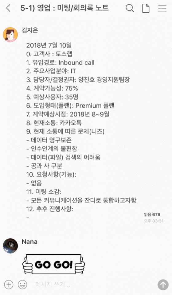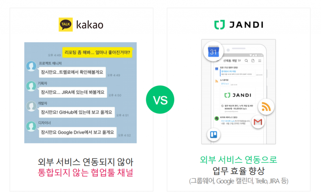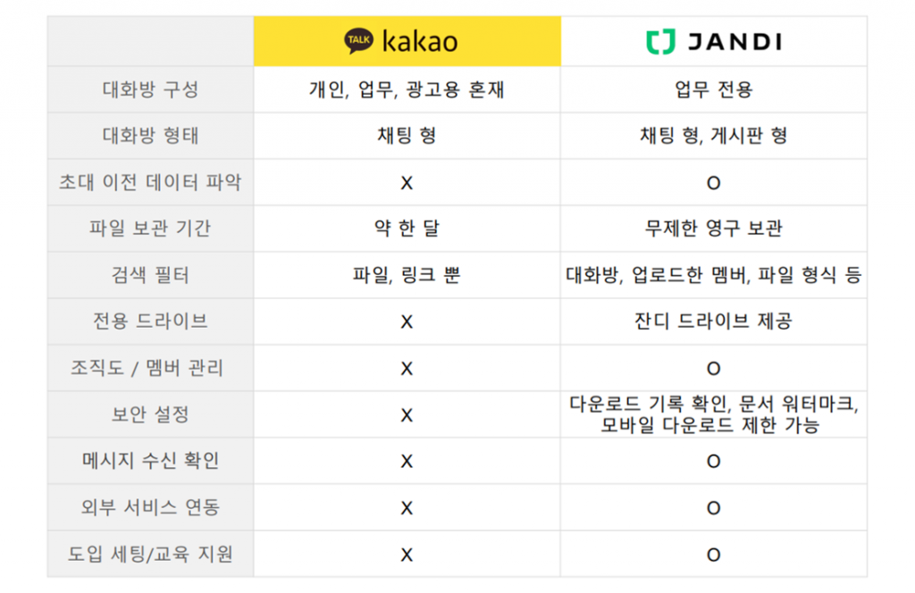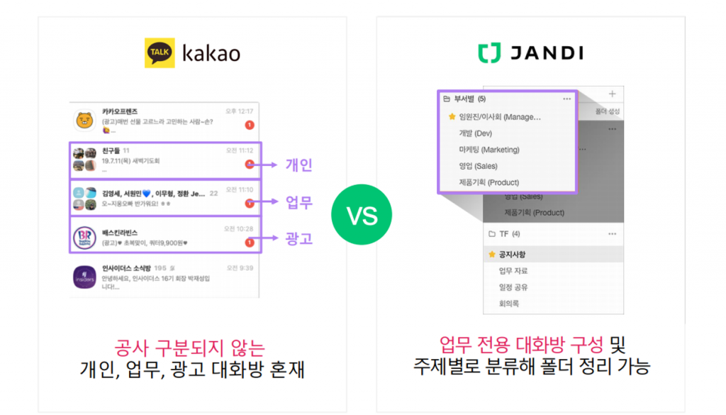 카카오톡은 핸드폰 번호를 기반으로 계정이 만들어집니다. 그래서 카카오톡으로 업무를 하다 보면 개인 채팅방과 업무 채팅방, 광고 등이 섞여 있어 관리가 어려워지게 됩니다. 또한 카카오톡의 그룹 채팅방은 나중에 참여한 사람은 이전 대화 내역을 볼 수 없기 때문에 업무 히스토리를 파악하기 어렵습니다.