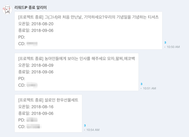 예를들어 와디즈 프로젝트가 [0. 킥오프 대기 → 1. 킥오프 완료→ 4. 최종 피드백 대기 → 6. 오픈 → 7. 종료 → 9. 오픈 후 중단] 등의 과정으로 프로젝트가 진행될 때 마다 ‘현 진행상태’ 열의 값을 바꿔주면, 담당자에게 자동으로 알림이 가게 됩니다.