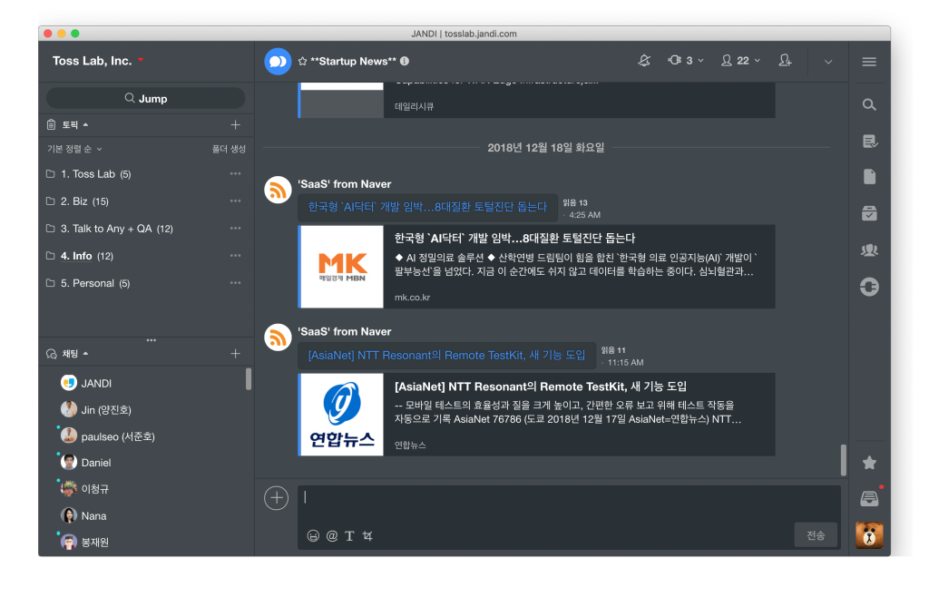 잔디(JANDI)의 2018년 어떤 기능을 개발했고, 2019년 어떻게 개발할 것인지 등을 설명해주셨습니다. 2018년 상반기에는 새로운 기능에 주력했고, 하반기에는 안정성과 속도향상에 집중하였다고 했습니다.