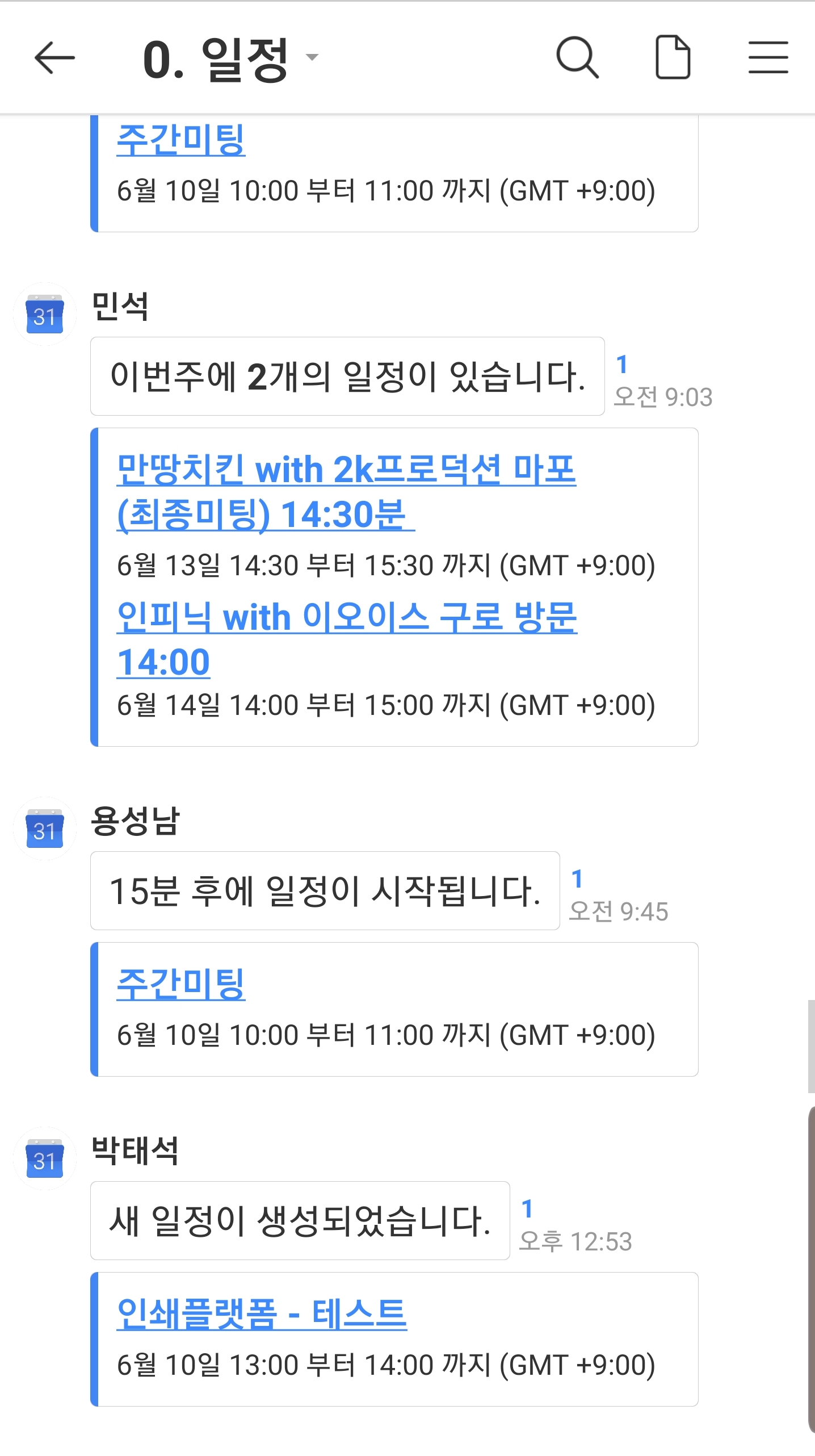 전사 멤버들의 일정이 투명하게 공유되도록 구글 캘린더를 연동한 일정 토픽