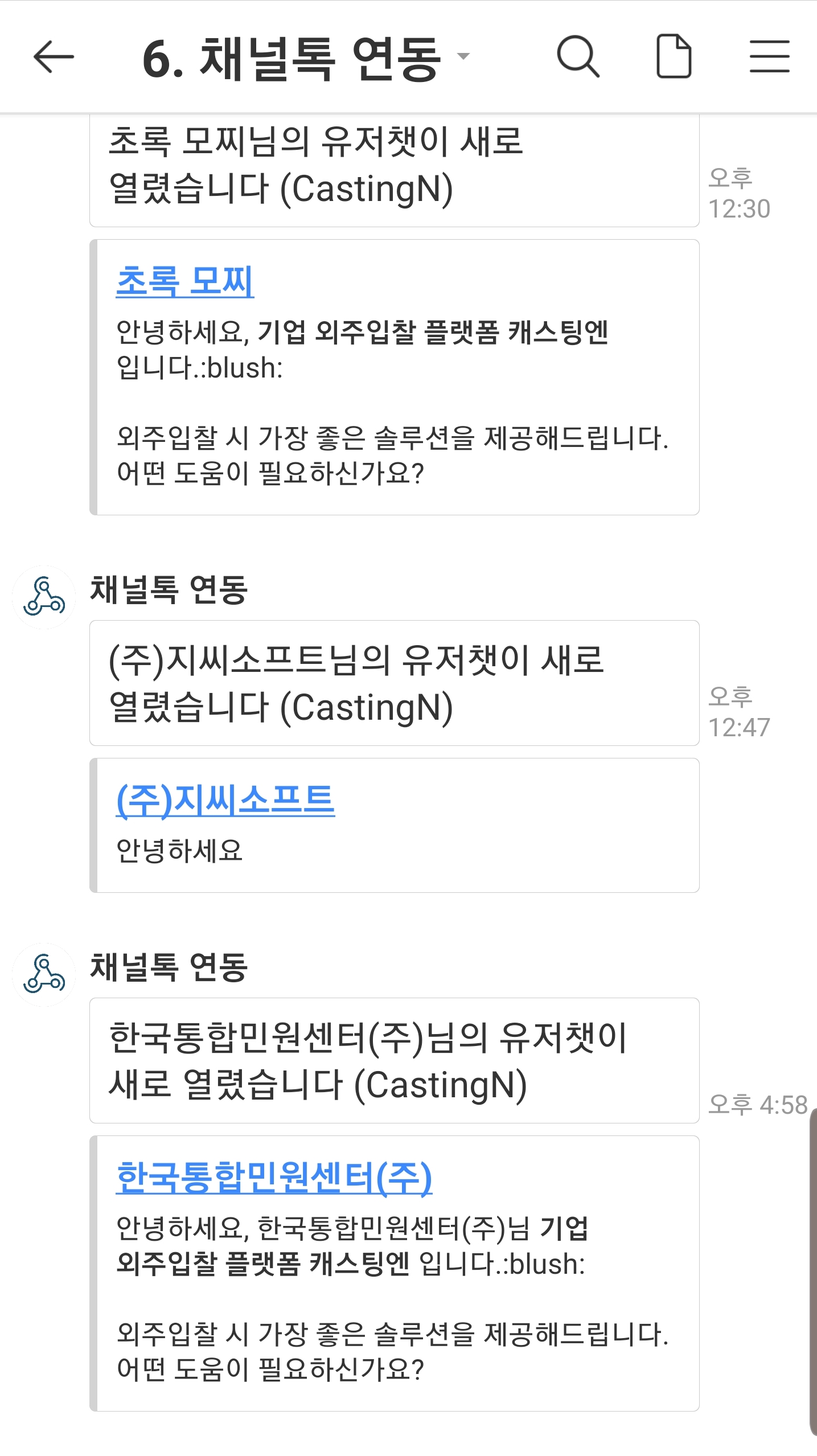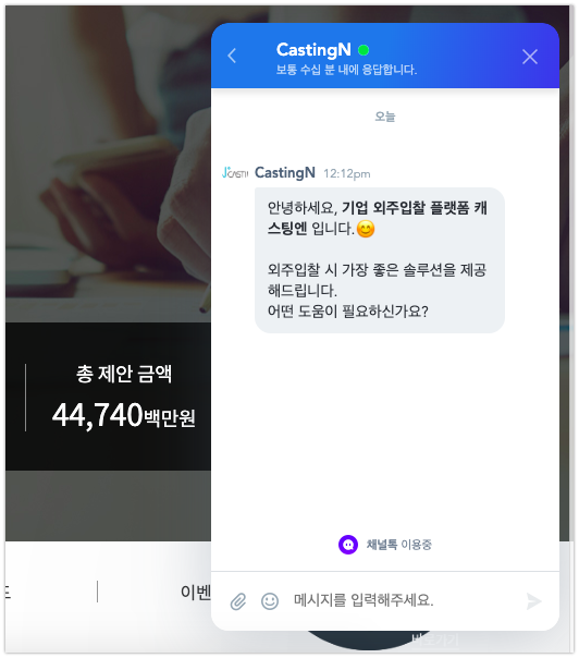 이 때 상담 솔루션 채널톡을 사용 중인데요, 잔디와 최근에 연동 기능이 가능하게 되어 바로 작업을 완료했습니다! 본격적으로 주 52시간제 도입에 따라 중소 중견 기업이 이용하는 기업형 입찰 서비스인 캐스팅엔에 더 많은 사용자분들의 문의가 올 것으로 예상됩니다. 이 때 채널톡과 잔디 연동이 증가하는 고객 문의를 효율적으로 대응하는 데 큰 도움이 될 것으로 기대합니다.