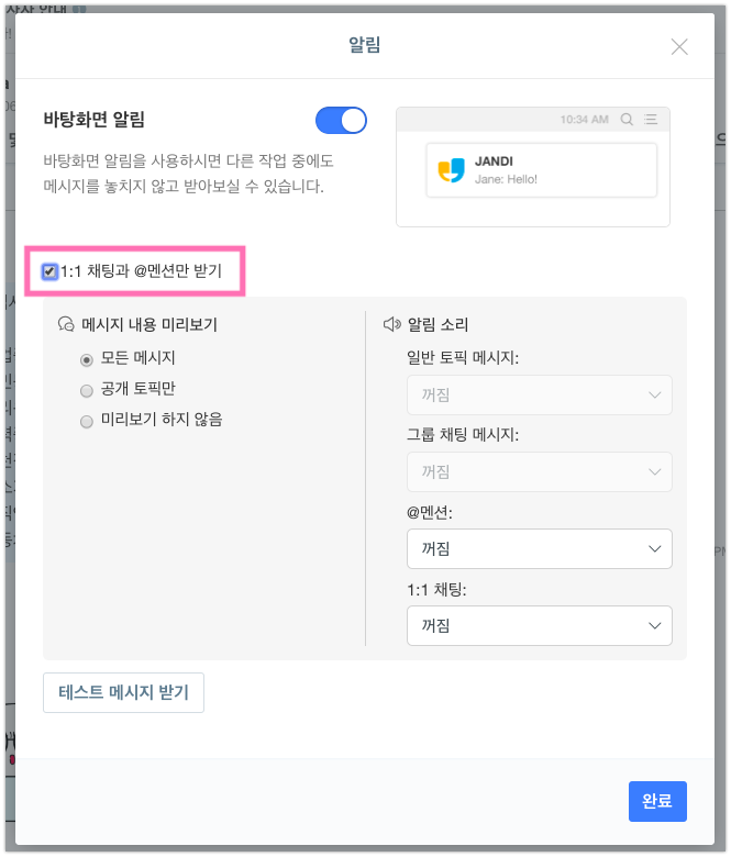 채팅과 멘션만 바탕화면 알림받기도 가능해요.