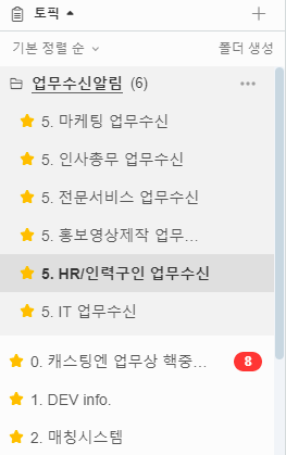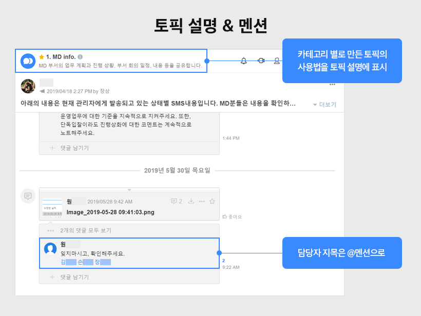 의뢰 카테고리별 토픽에서 업무 현황을 공유하고 담당자는 멘션