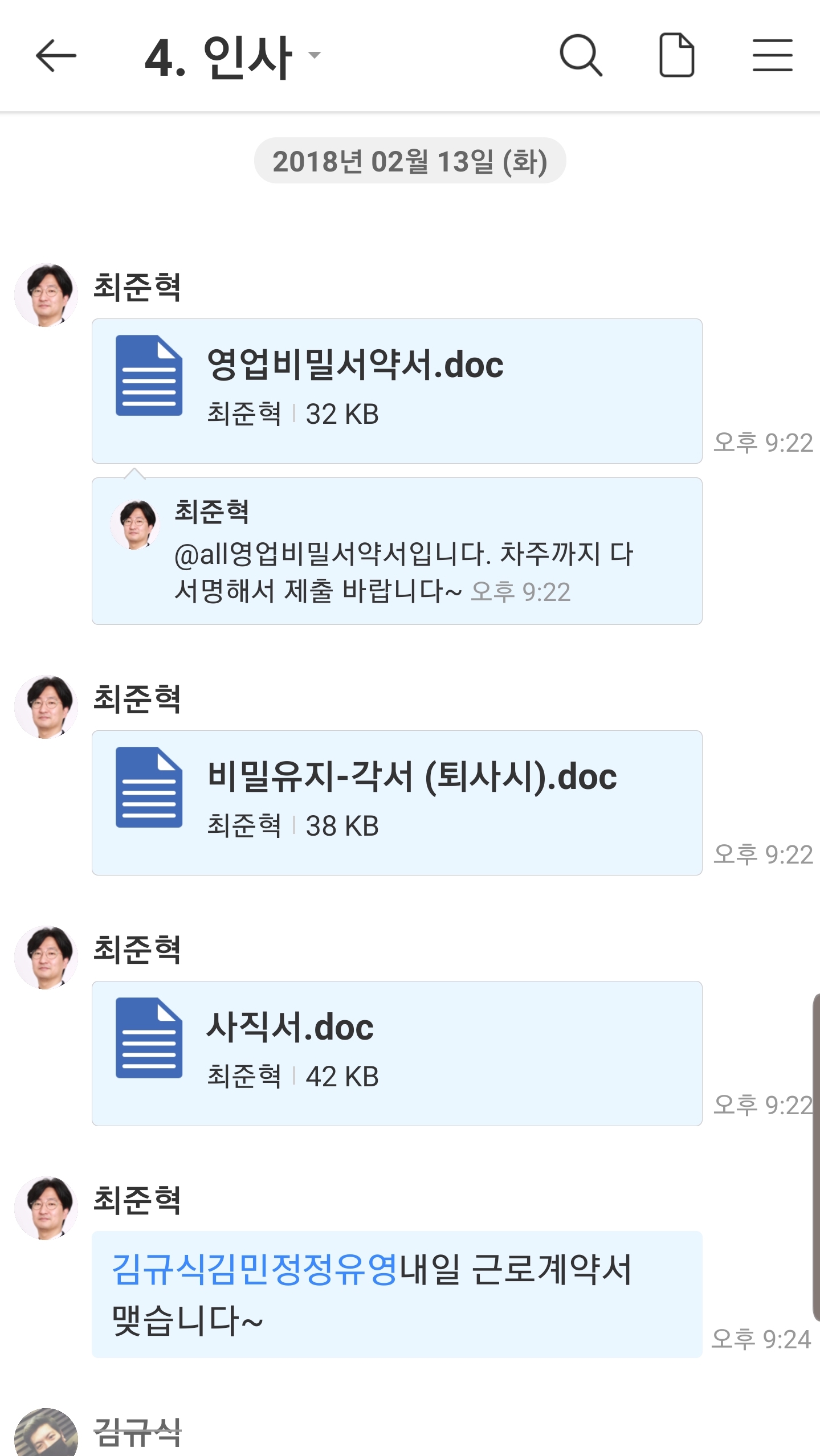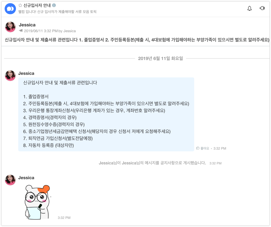 예전에 잔디를 만드는 토스랩 팀에서는 신규입사자 안내를 위한 OT 토픽을 운영하고 있다고 배운 적이 있습니다. 이를 따라서 캐스팅엔은 ‘인사’라는 토픽을 만들고 신규 입사자들에게 필요한 서류를 전달하고 있습니다. 인사팀이 자주 멤버들에게 작성을 요청하는 서류들을 이 토픽에 올리고 절차를 안내합니다. 입사하는 순간부터 잔디 활용법을 익히고 오픈 커뮤니케이션을 중시하는 팀 문화를 이해하는 데 도움이 됩니다.
