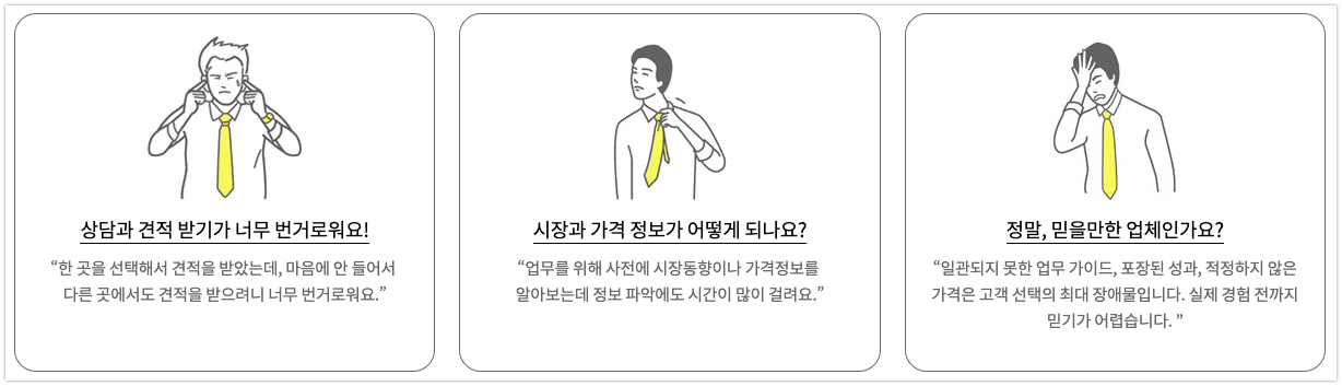 이용자가 서비스를 제공하는 공급 업체의 답변만 가지고 아웃소싱 서비스를 진행하기는 매우 어렵습니다. 공급 업체의 말만 의존할 경우 이용자가 객관적인 정보를 얻기가 쉽지 않아요. 결국 아웃소싱 구매 서비스를 사용할 때 이용자들이 가장 많이 고민하는 것은 적정한 가격과 결과물에 대한 예측 가능성처럼 겉만 보고 판단할 수 없는 부분이 대부분이기 때문입니다.