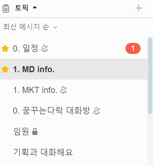 요즘엔 사내 커뮤니케이션이 너무 많아져서 오히려 문제입니다 ^^ ; 서로 업무 흐름을 끊지 않도록 팀원들이 자발적으로 잡담은 전용 대화방에서만 하거나 토픽 주제에 어울리지 않는 내용은 자제하기로 내부적인 룰을 지키려고 노력 중입니다.