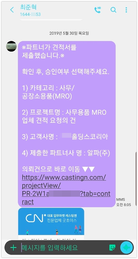 개인 핸드폰 문자로 받은 의뢰 견적서는 취합하기 어려워요.