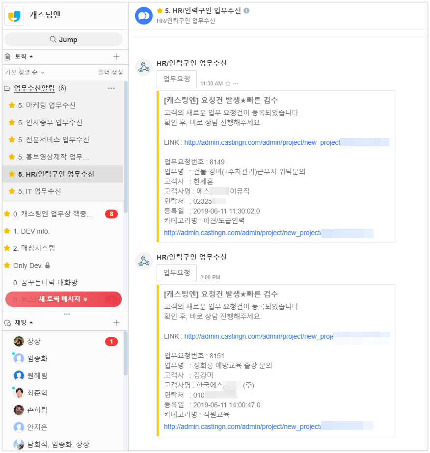 특히 캐스팅엔 웹사이트에서 아웃소싱 의뢰가 들어올 경우, 각 카테고리의 ‘업무수신’ 토픽에 자동으로 의뢰 문의 메시지가 들어오도록 인커밍 웹훅 (Incoming Webhook)을 연동했습니다. 사무실 밖에 있더라도 모바일 잔디로 업무 수신 현황을 동일하게 확인이 가능합니다.