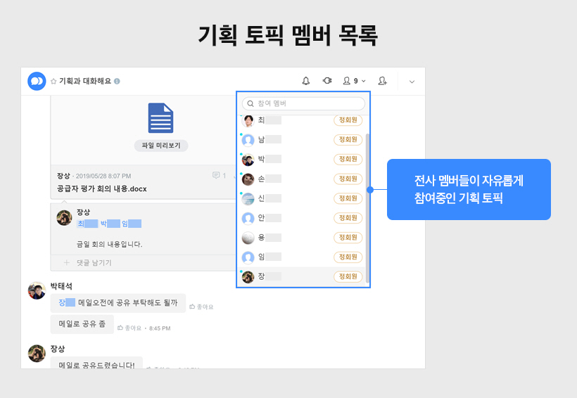 업무 아이디어와 진행 상황이 모두 공개되는 기획 토픽