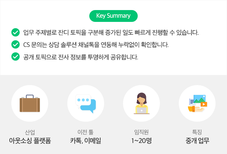 결혼 중개회사, 헤드헌터, 물류/무역회사, 부동산 중개업 등 다양한 중개 플랫폼 기업에 잔디를 적극적으로 추천합니다. 3자가 지속적으로 커뮤니케이션이 필요할 때 중개 플랫폼은 잔디를 통해 고객 – 중개 플랫폼 – 공급업체가 주고받은 대화를 교통정리 하고 기록해둘 수 있기 때문입니다.