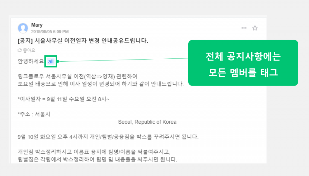 긴급하게 업무를 요청할 때 담당자가 바로 볼 수 있도록 @멘션을 자주 사용합니다. 또한 전체 공지를 할 때는 @all을 사용합니다.