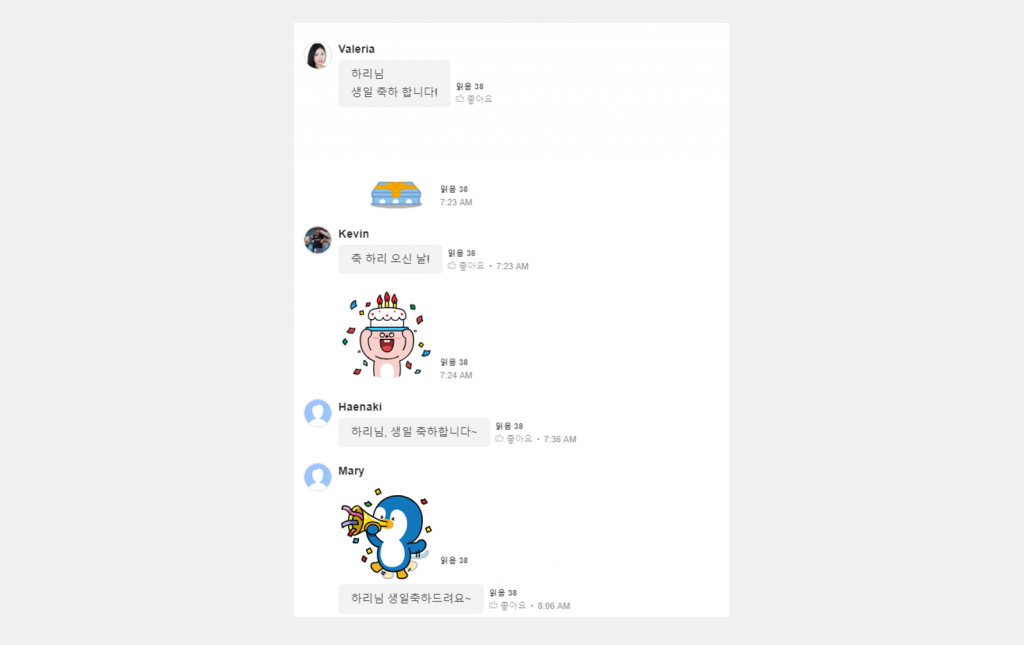이 밖에도 메시지 수신 확인이나 휴가 중 부재중 표시, 좋아요, 이모티콘을 자주 사용하고 있습니다.