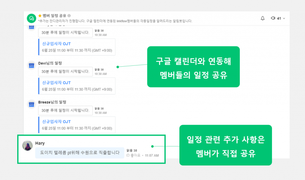 멤버들이 외근이나 출장이 많은데 잔디에 구글 캘린더를 연동해 공유를 하니까 팀원들이 각자 어디에서 무엇을 하고 있는지 알 수 있습니다. 즉, 일정 관리와 인사 관리가 동시에 가능해졌습니다.