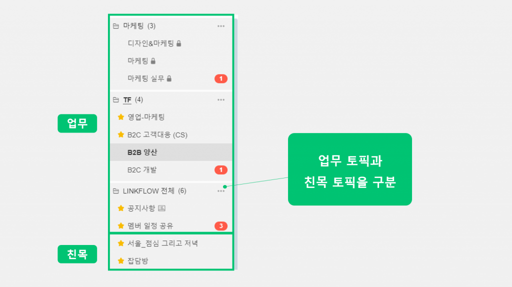 새로운 협업툴을 처음에는 낯설어하는 분들이 많았습니다. 그래서 일부러 많은 토픽을 만들어 어떤 토픽을 많이 사용하는지 테스트하는 기간을 가지며 토픽에 익숙해지도록 했습니다. 지금은 부서별 토픽, TF 팀 토픽, 일정 관리 토픽, 식사 토픽 등으로 나누어 사용하고 있습니다. 또한 업무 대화를 나누는 토픽과 친목 토픽을 구분해 효율적으로 활용하고 있습니다.