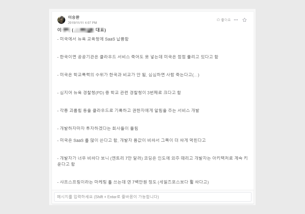 사실 대표가 외근을 다녀오면 또 어디서 놀다 왔다는 오해(?)를 받기도 하잖아요. 그래서 미팅을 다녀오고나서 이런 걸 보고 듣고 왔다고 공유하는 토픽이에요.