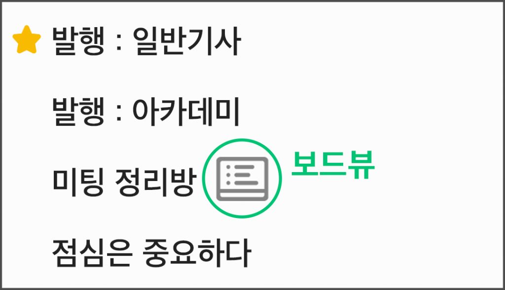 - 보드뷰 : 게시판처럼 내용을 올릴 수 있어서 공지사항이나 피드백이 필요한 정보를 공유할 때 유용해요. 미팅 정리방을 보드뷰로 쓰고 있어요.