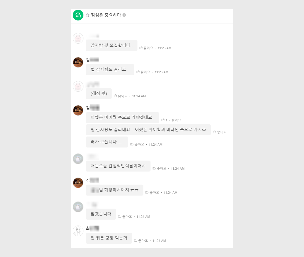 보통 가장 활발한 토픽이에요. 재밌는 건, 어떤 토픽이 활발한지에 따라 사내 분위기를 대충은 읽을 수 있더라구요. 분위기가 조금 안좋은 날이면 점심 토픽도 조용해요.