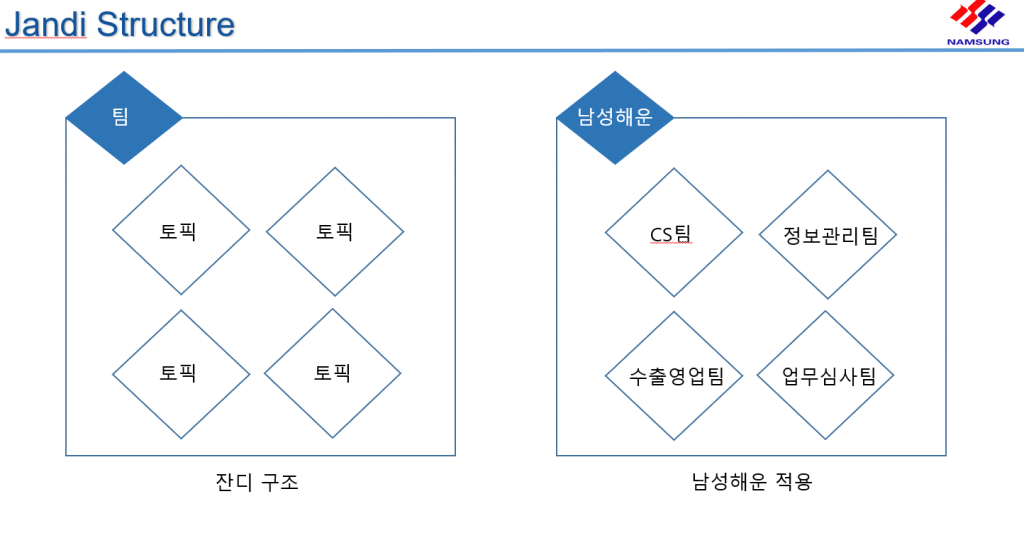 잔디 PoC를 위한 사내 PT도 진행했습니다. 어떤 방식으로 잔디를 도입할 거고, 테스트 기간은 몇 개월 동안 진행할 것인지, 함께 테스트를 진행할 워크 그룹의 인원을 안내하고 ‘이메일보다는 잔디를 써달라’는 요청을 하였습니다. 워크그룹의 잔디 이해를 돕기 위해 “팀 = 남성해운”, “토픽 = 각 부서”로 생각하면 된다고 설명을 했고 토픽은 각 부서마다 그리고 해외는 사무소마다, 대리점은 대리점끼리 모아서 토픽을 정리했습니다.
