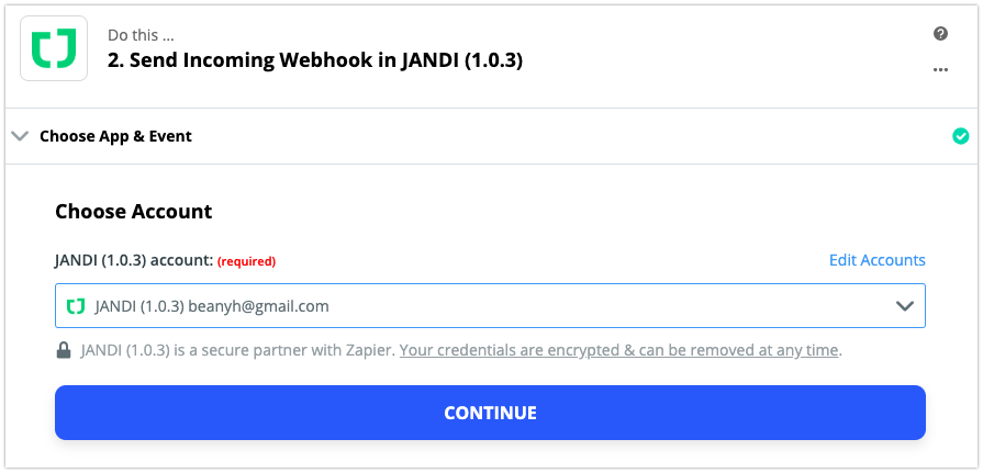 Action Event는 자동으로 Send Incoming Webhook으로 선택됩니다. 완료 후 [CONTINUE] 버튼을 클릭해 다음 단계로 넘어갑니다.