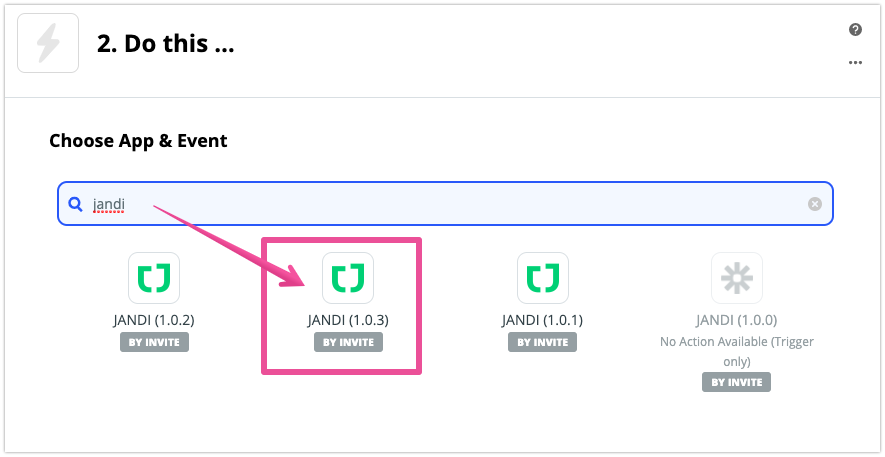 3-6. 위에서 받아온 먼데이닷컴 Update 데이터를 이제 잔디 메시지로 변환할게요. 2.Do this… 부분에서 ‘JANDI’를 키워드로 검색해서 JANDI 1.0.3 어플을 선택합니다.