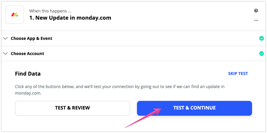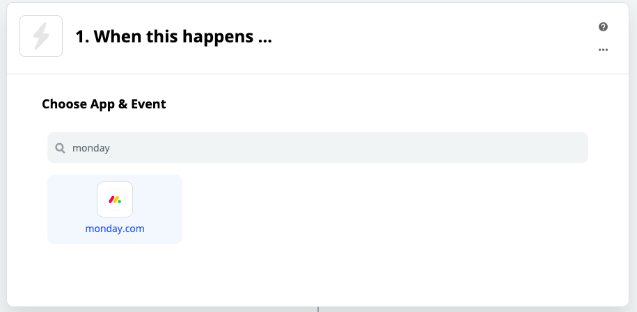 3-2. 1.When this happens 단계에서 Monday.com 앱을 검색해 선택합니다.