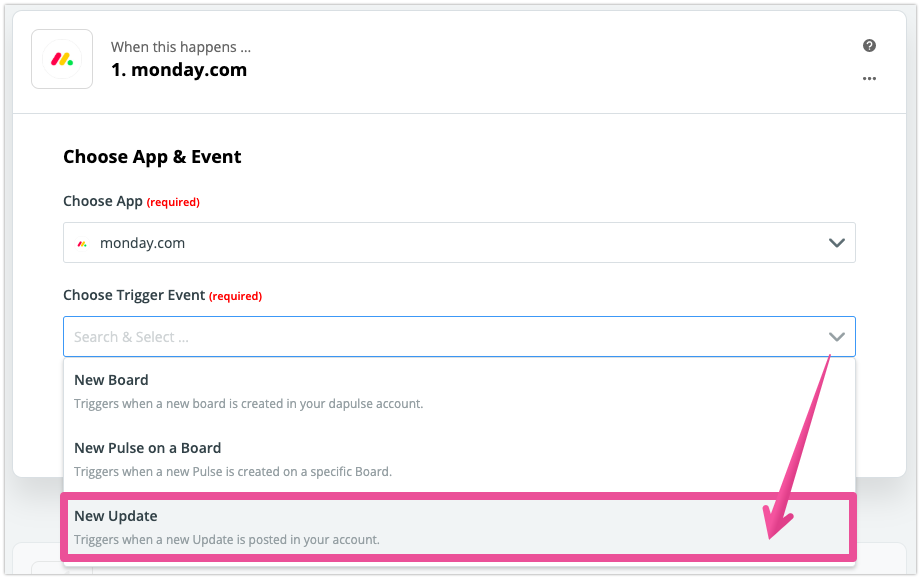 - 물론 이 Trigger 기준을 New Pulse, New Board 등 다양한 다른 알림받을 기준으로 선택할 수도 있습니다.