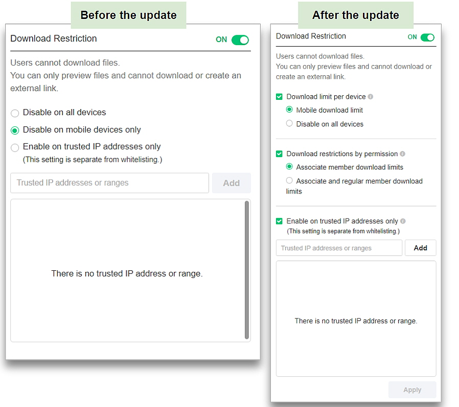 Our previous download restrictions were for device types and IP addresses. With the new update, you can set more specific download restrictions on device type, IP, and member status.