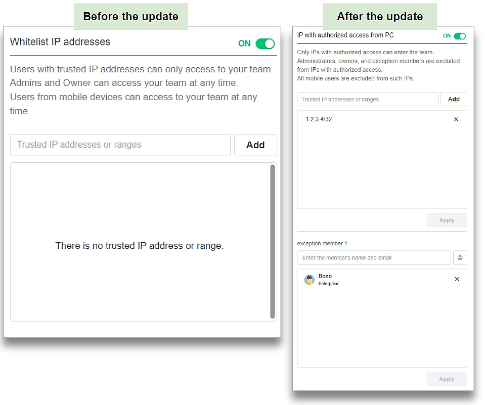 On top of allowing access to particular IP addresses, you can not add exceptions for the IP address. Setting up exceptions for the IP address will enable members not working through the IP address to access your team.