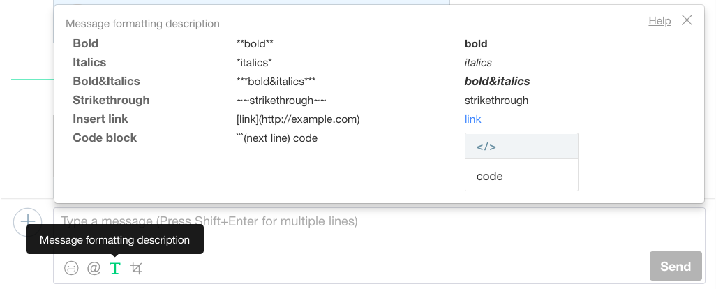 You can find the message formatting description by clicking the [T] button below the input field where messages are written. As the examples and methods of adding effects are expressed, it is convenient to refer to it and use it whenever effects are needed.
