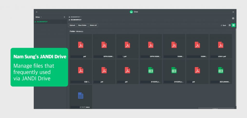 We do not use JANDI drive company-wide. But certain overseas locations are using it well. Rather than uploading files to chat rooms, it’s easier to take a look with just a glance if you put files on a drive to manage them.