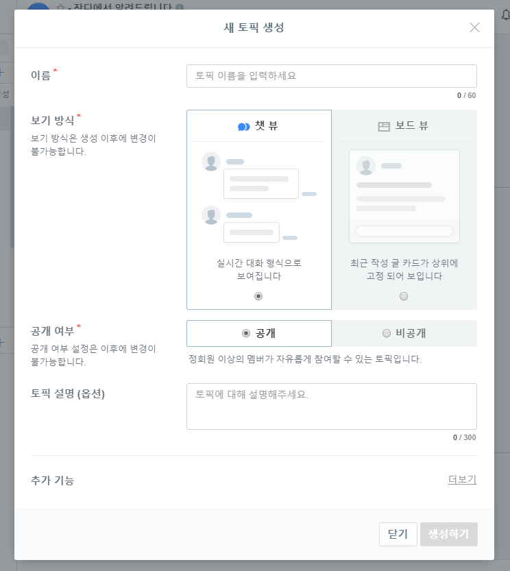 - 토픽 보기 방식과 공개 여부 설정은 한 번 토픽을 만들면, 나중에 변경이 불가능하니 신중히 선택해주세요~