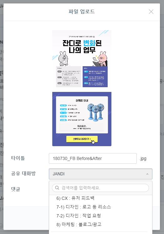 3. 파일을 업로드할 대화방을 선택하고 파일에 대한 설명을 댓글로 입력해주세요.